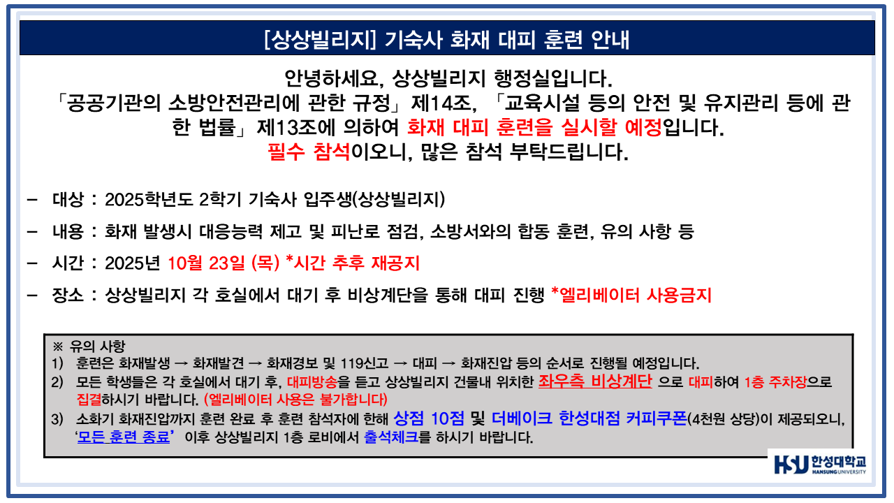 [상상빌리지] 기숙사 화재 대피 훈련 안내 (상점 10점 부여)